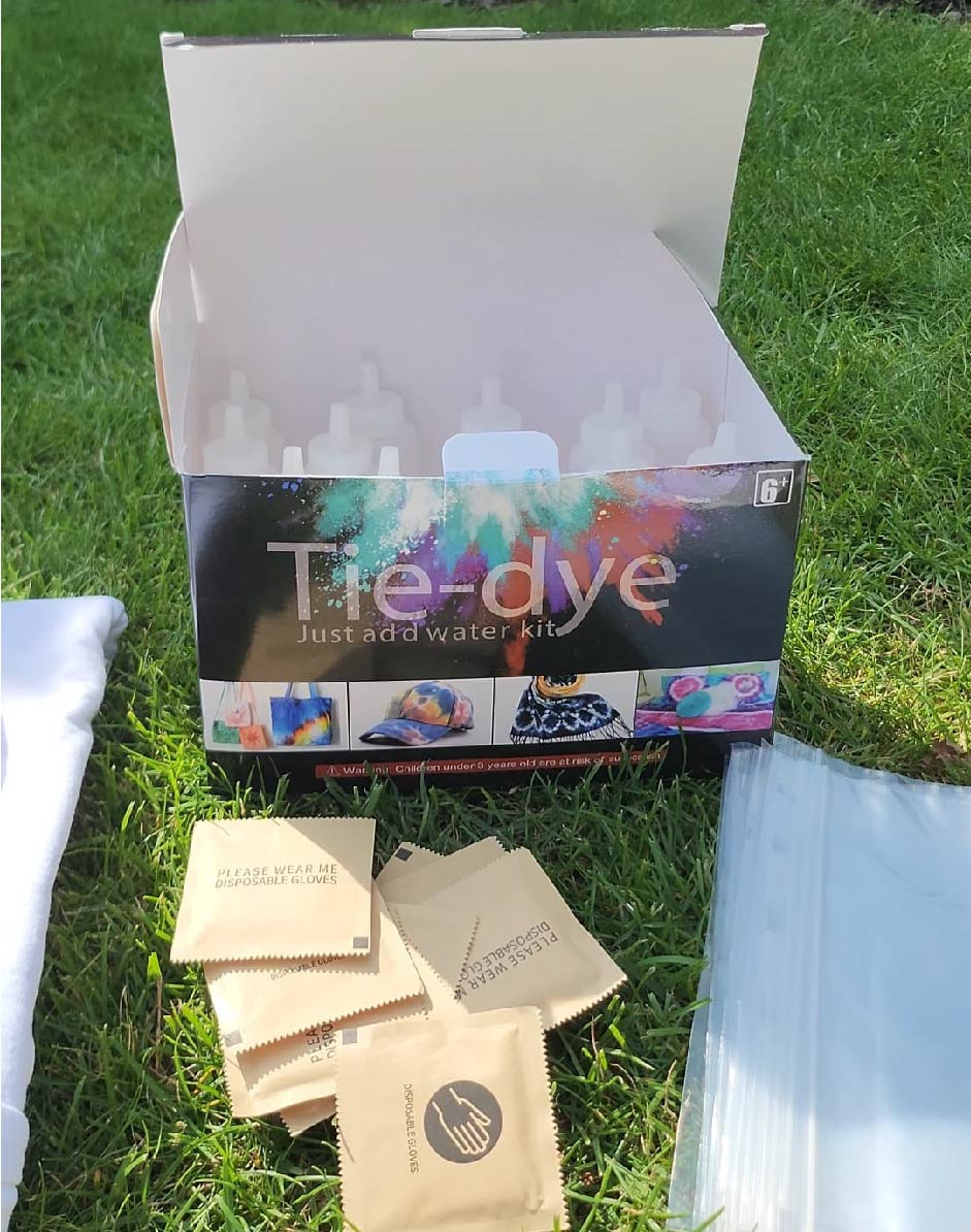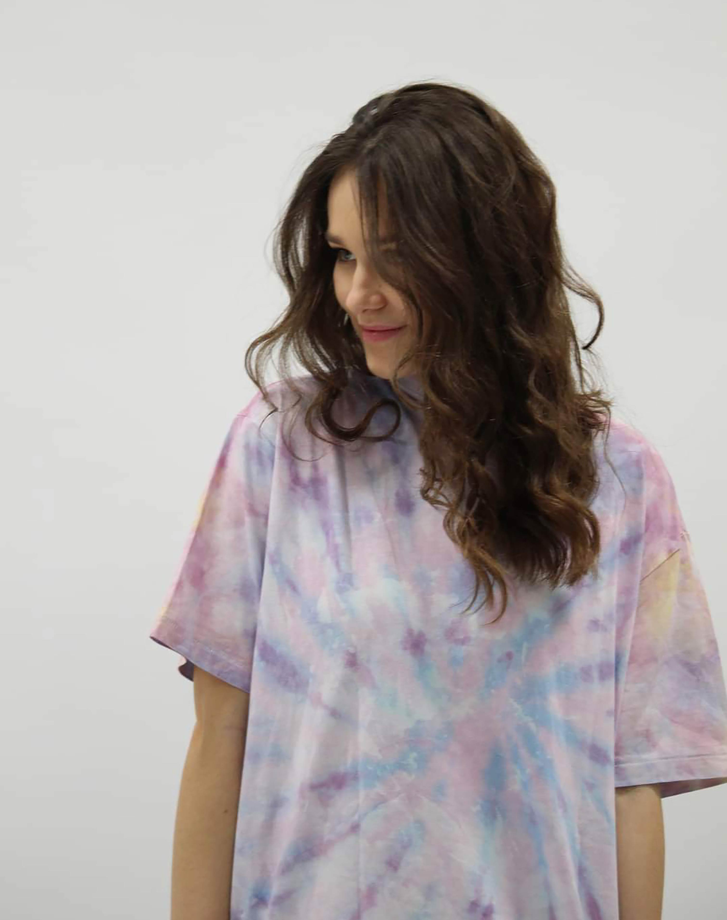 Verwende Gummibänder, um das T-Shirt zu binden und verschiedene Bereiche abzustecken. Du kannst das T-Shirt zerknittern, falten oder eindrehen und die Gummibänder an den gewünschten Stellen platzieren (in der Anleitung im Batik-Set) findest du Beispiele). Je nachdem, wie du das T-Shirt bindest, entstehen unterschiedliche Muster.